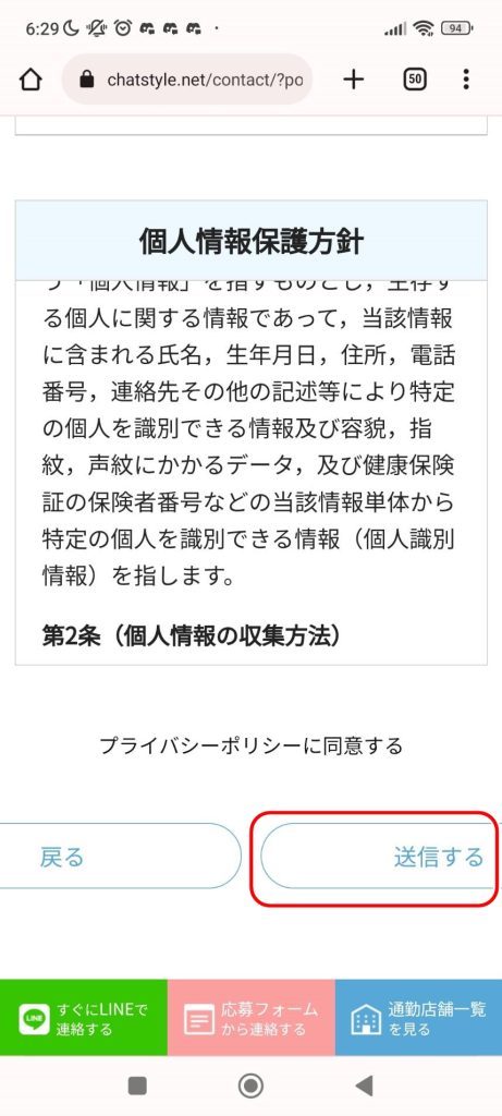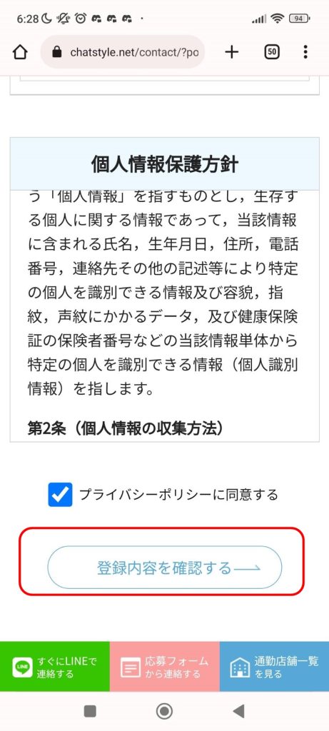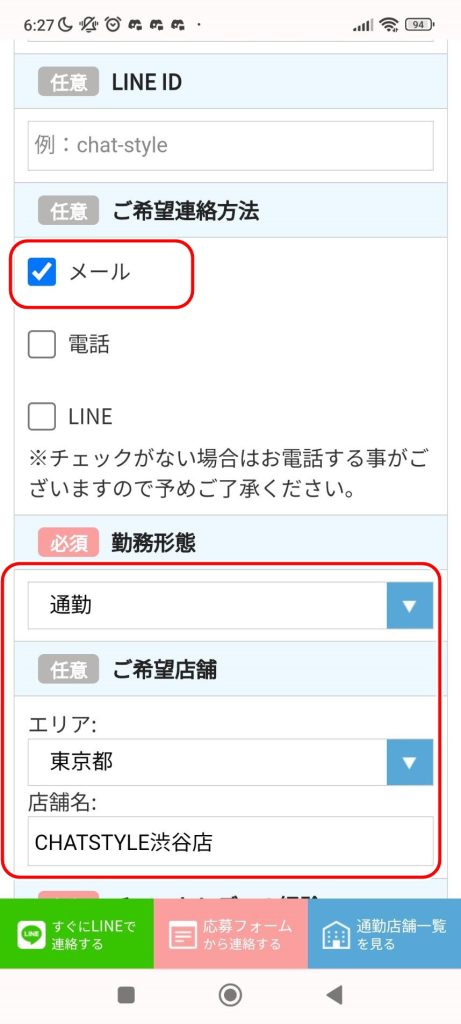 チャットスタイルでは、スマホから簡単フォームより1日体験入店に関する問い合わせ、申し込みができるので、必要事項を記載しておきましょう。