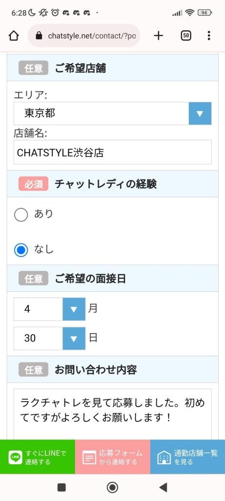 チャットレディの仕事が未経験でも、チャットスタイルでは簡単フォームから、1日体験入店の問い合わせができます。